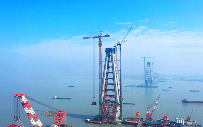 大橋6號墩的安裝高度更是高達(dá)379米,這里面的難度,不僅僅是體現(xiàn)在鋼塔階段的吊裝,實際上從一開始的承臺內(nèi)基礎(chǔ)節(jié)的預(yù)埋、再到隨后塔身的頂升加高、附著,再具體到高壓的用電,以及后面數(shù)千米鋼絲繩的維修保養(yǎng)、設(shè)備使用完成之后的拆除,任何一個環(huán)節(jié)和細(xì)節(jié)都不能出現(xiàn)差錯。