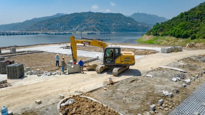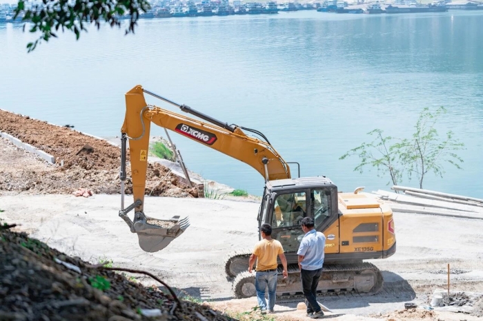 XE135G正在進(jìn)行夔門旅游碼頭建設(shè),進(jìn)行砂石挖裝、路基填筑、水泥轉(zhuǎn)運(yùn)等作業(yè),性能穩(wěn)定,可謂是工地上的“多面手”。