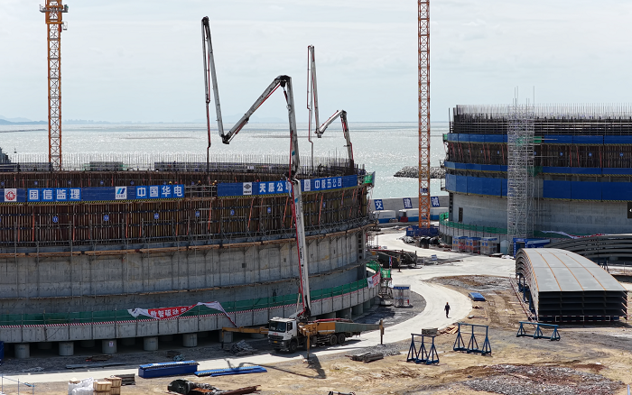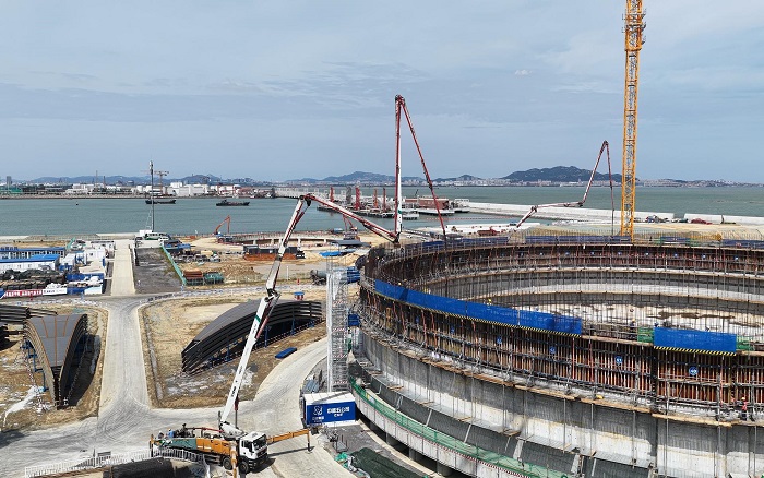 隨著各環(huán)節(jié)建設(shè)有序推進,3座22萬立方米的LNG(液化天然氣)儲罐正式進入罐體墻體澆筑。每座儲罐高達50多米,相當于18層樓高度,海風裹挾的高濕度環(huán)境,給高空作業(yè)難度層層加碼!