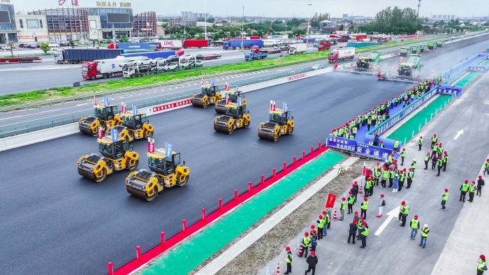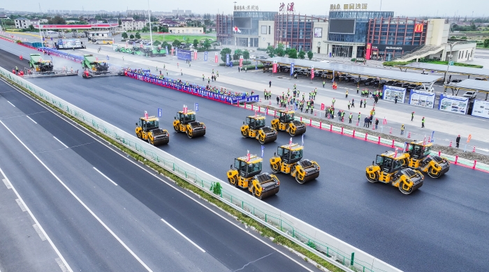 滬武高速施工現(xiàn)場,2臺攤鋪機(jī)+12臺壓路機(jī)組成“全球最大規(guī)模智慧施工集群”。