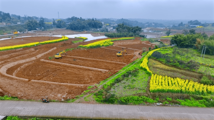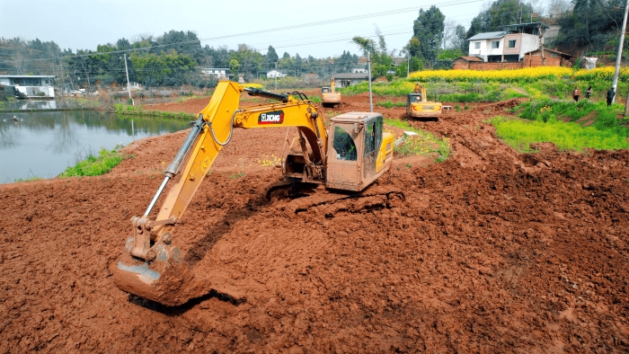 洪雅向東90公里,是仁壽縣,作為四川省產(chǎn)糧大縣,仁壽曾因田塊細(xì)碎導(dǎo)致機(jī)械化率不足。在5000畝的高標(biāo)準(zhǔn)農(nóng)田建設(shè)中,項(xiàng)目方集結(jié)18臺(tái)徐工挖掘機(jī),以“日均30多畝”的速度搶抓工期。