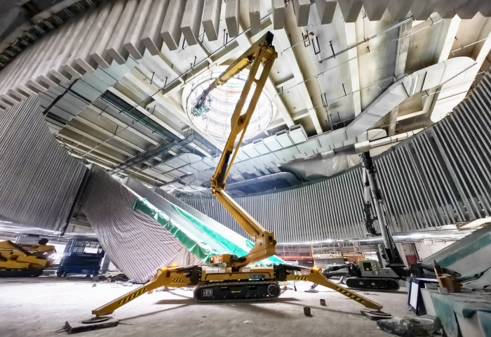 現(xiàn)場(chǎng),徐工多臺(tái)XGA26X-Li蜘蛛履帶式曲臂高空作業(yè)平臺(tái)正在如火如荼進(jìn)行室內(nèi)施工作業(yè),主要負(fù)責(zé)博物館大樓四樓中廳內(nèi)部的裝修安裝,作業(yè)區(qū)域總高20米,空間狹小且需跨障作業(yè),常規(guī)車(chē)輛無(wú)法同時(shí)滿(mǎn)足這兩個(gè)作業(yè)條件,蜘蛛車(chē)憑借0.99m超窄車(chē)身及13.2m作業(yè)幅度,成為施工方的絕佳選擇,完美適應(yīng)現(xiàn)場(chǎng)緊急的竣工工期,獲得現(xiàn)場(chǎng)施工方一致好評(píng)。
